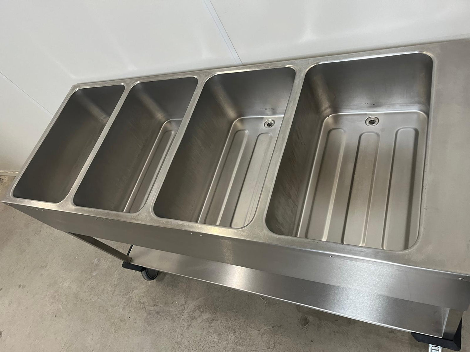 Bain mariewagen 4x 1/1GN, bediening korte zijde, 4 zwenkwielen 2 met rem, 230V 3,4kW, afmeting 602x1491x902mm. Jaar 2023