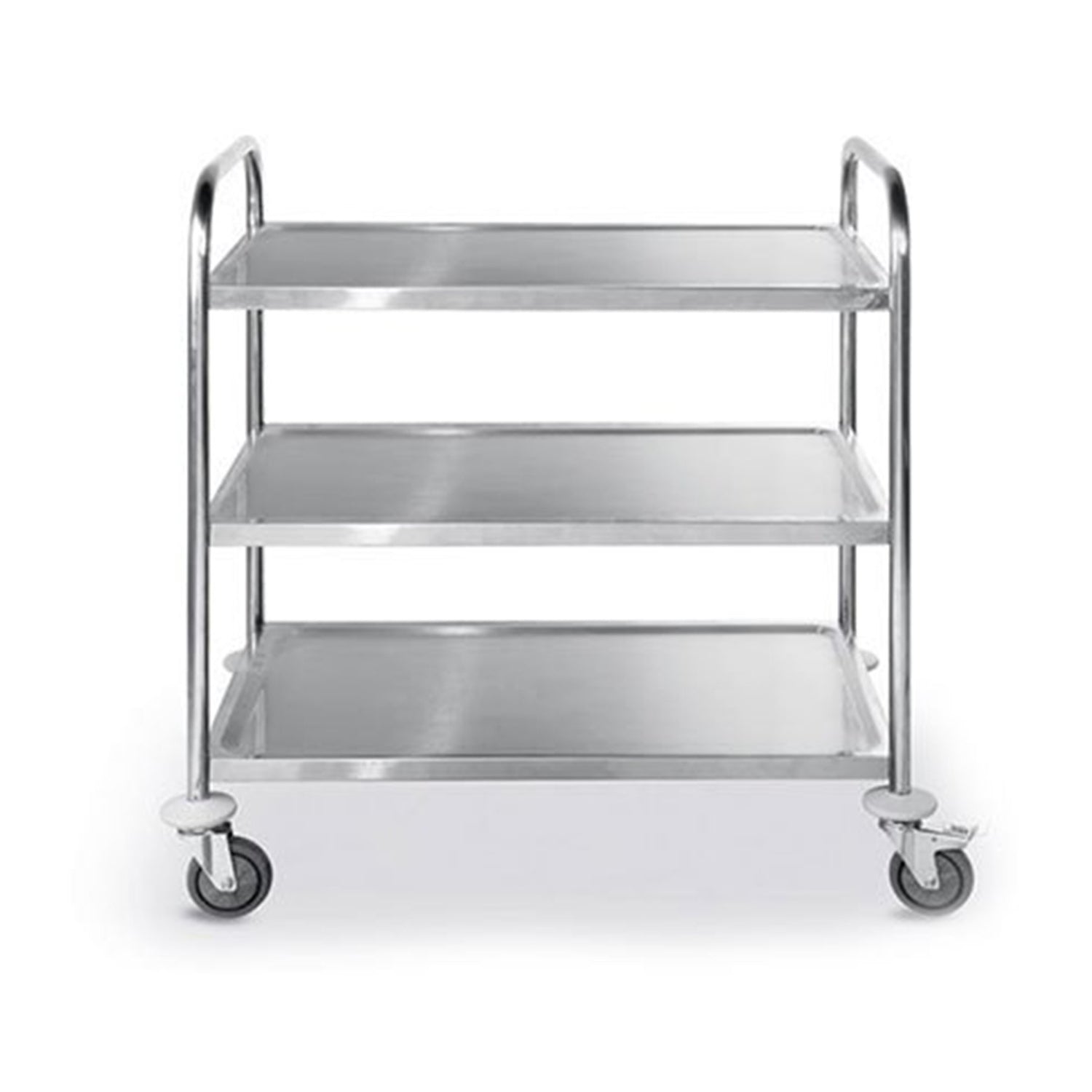 Metos serveerwagens zijn geschikt voor serveren en afruimen van serviesgoed, levensmiddelen, dranken e.d. De Metos zware uitvoering serveerwagen Cannes heeft 3 RVS plateau’s met waterkering rondom en heeft een afmeting van 965 x 625 x 1025. De bladen van de serveerwagen zijn volledig gelast aan het frame van de wagen. Onder de bladen zit een omegaprofiel gemonteerd tegen het doorhangen.