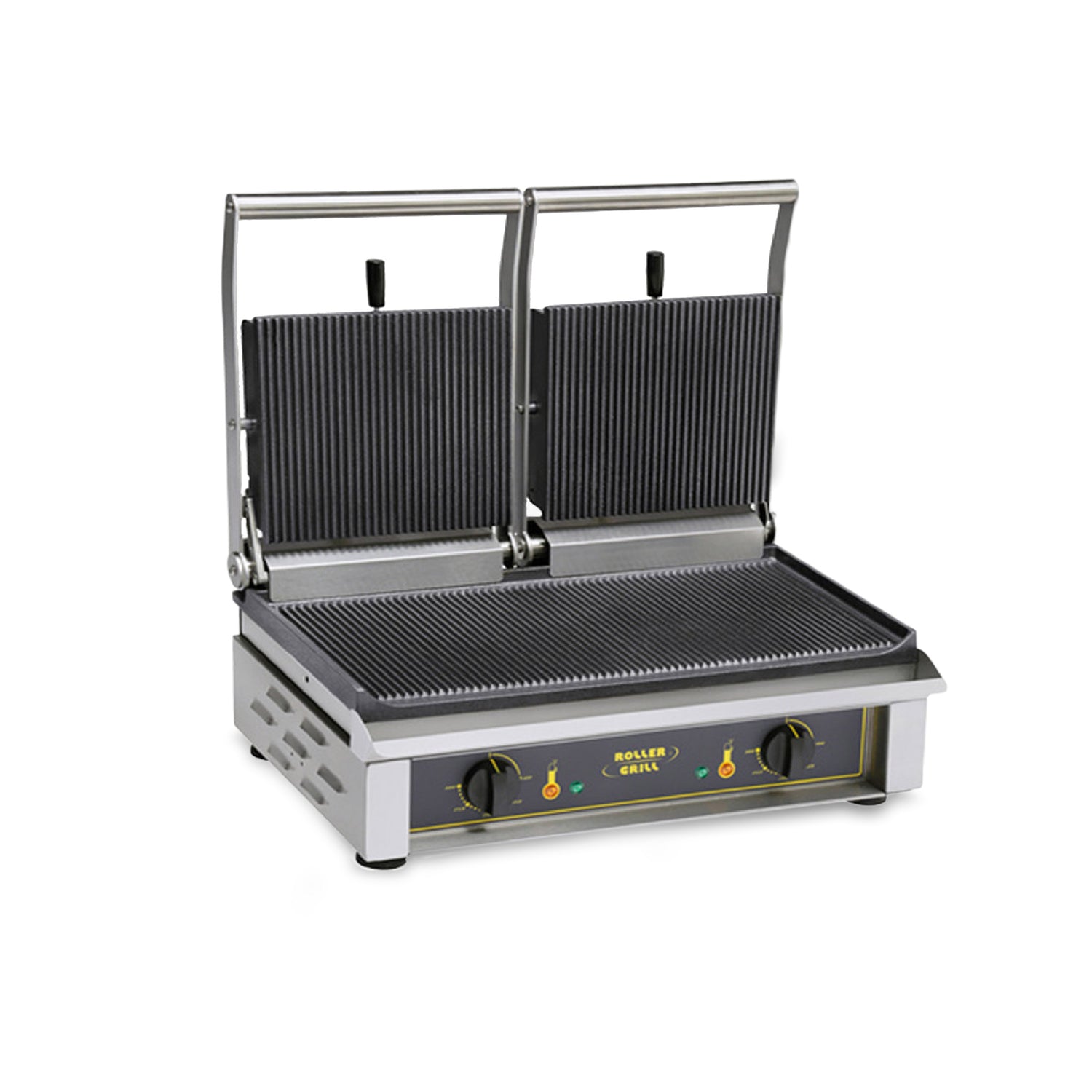 De Metos Performance Contactgrill heeft een enkele geribbelde grillplaat onder en en twee geribbelde platen boven. De platen bereiken snel een gelijkmatige temperatuur van maar liefst 300 graden. Door de afzonderlijke thermostaten kun je de twee delen los van elkaar instellen en gebruiken.