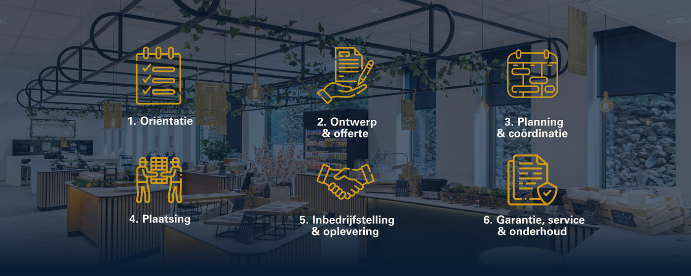 Samen met de projectleider en accountmanager lopen we alles zorgvuldig na en wordt het project officieel opgeleverd. Zo zorgen we ervoor dat jouw grootkeuken perfect aansluit bij de wensen en eisen die we in de oriëntatiefase hebben vastgesteld.
