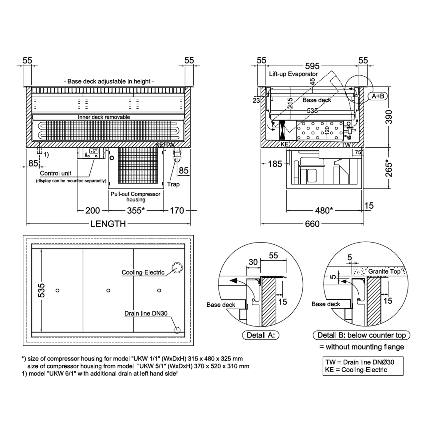 Deze stekkerklare koelbak heeft een verstelbare bodemplaat in te gebruiken voor 1/1 GN containers tot 150mm. De geforceerde roestvrijstalen koeling is volledig geïsoleerd met geschuimd polyurethaan, makkelijk schoon te maken en voorzien van een HD 30 afvoerpijp.